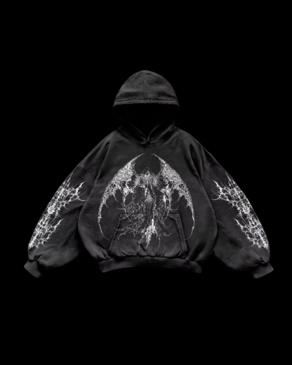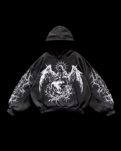 Washed black pullover with gothic white angel front prints and crackled thorn sleeves. Boxy oversized fit with dropped shoulders, kangaroo pocket, and ribbed cuffs/hem; heavy-weight knit with a soft brushed lining. Screen-printed graphics, durable stitching. Cotton blend, true to size, and ready to ship.