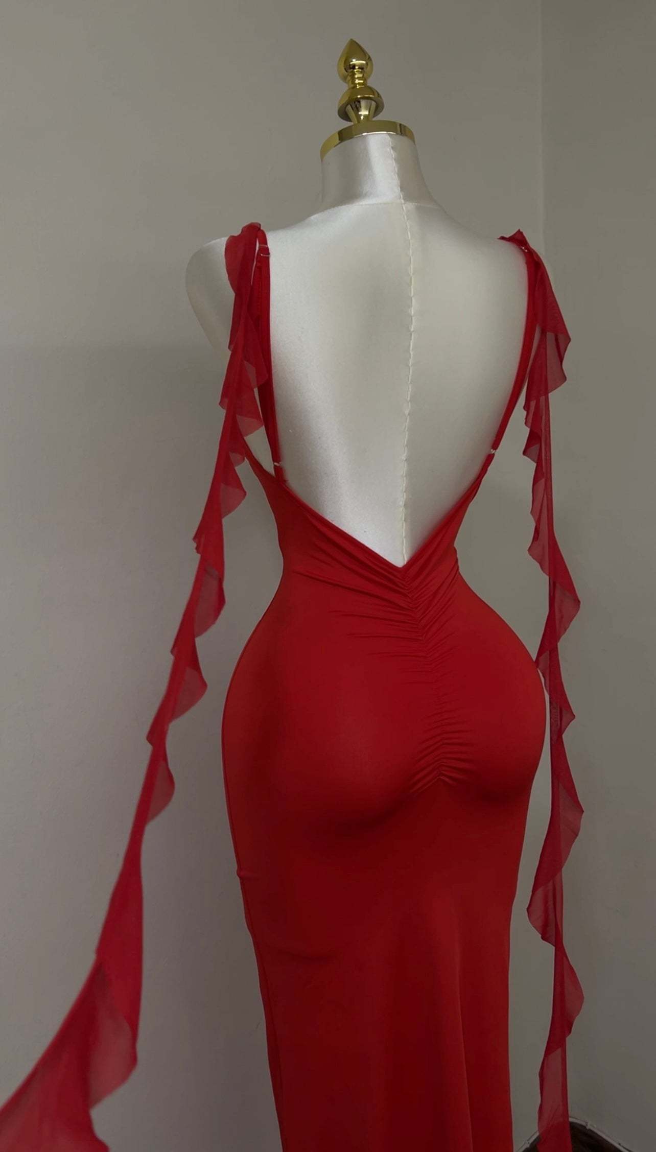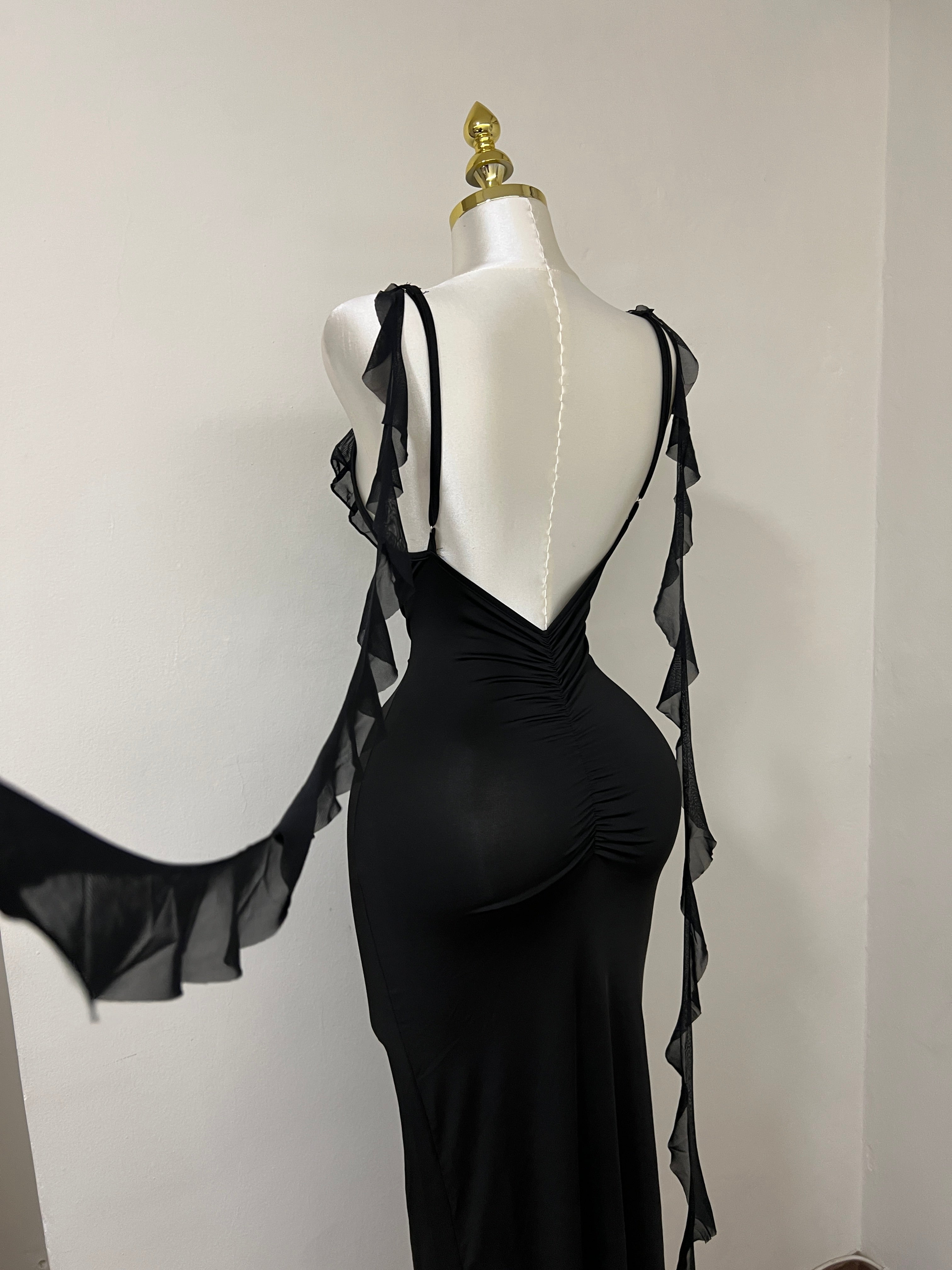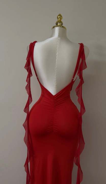 A sleek, backless dress designed to sculpt and flatter the body. Featuring slim straps and a smooth, figure-hugging silhouette, this piece blends minimal elegance with effortless allure—perfect for summer evenings and special occasions.