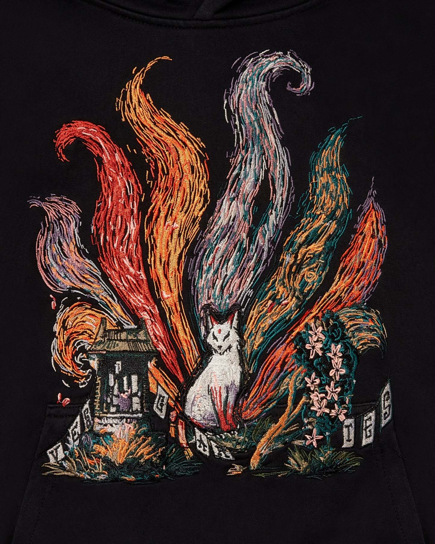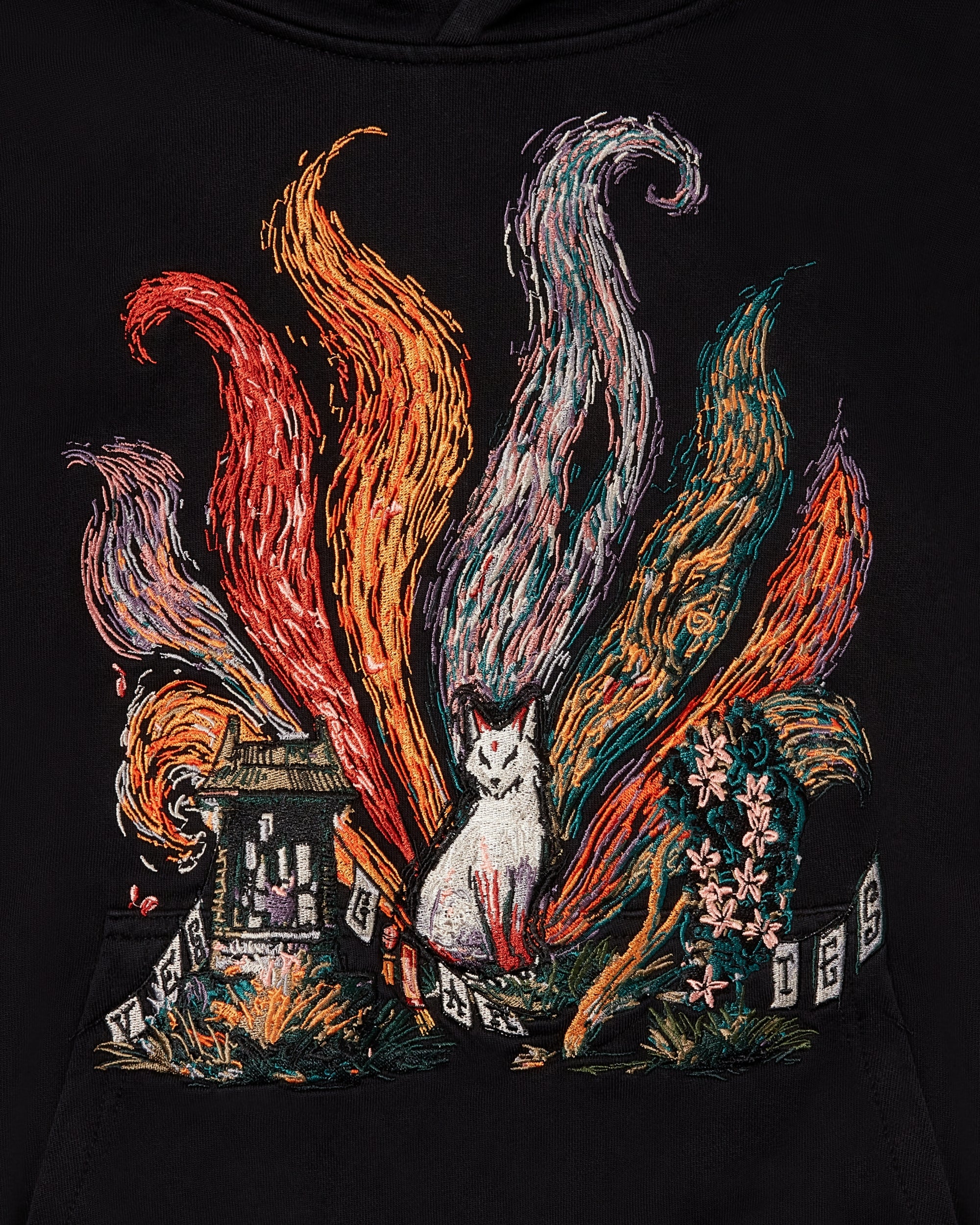 A heavyweight essential elevated through detailed storytelling, the Kitsune Hoodie features a fully embroidered scene rooted in Japanese folklore. The front artwork centres on a white fox, framed by a shrine and forest elements, with eight flowing tails rising above in vivid colour.