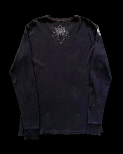Black thermal long-sleeve with an oversized fallen-angel print. Etched wings sweeping from shoulder to hem over baroque scrollwork. Longsleeve traps warmth without bulk; ribbed cuffs and a broken-in drape for that mid-2000s rock edge. Blend, true to size, and ready to ship.