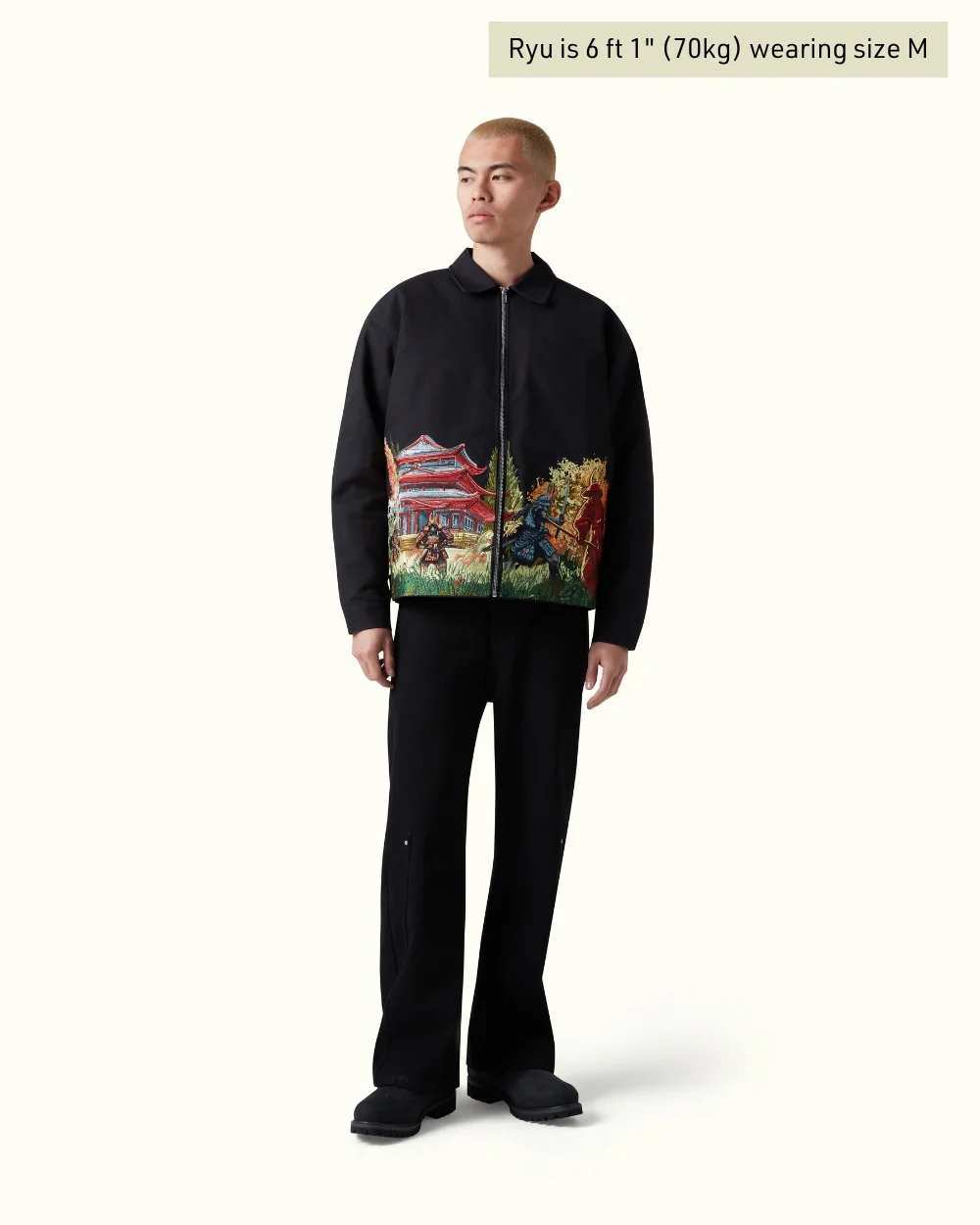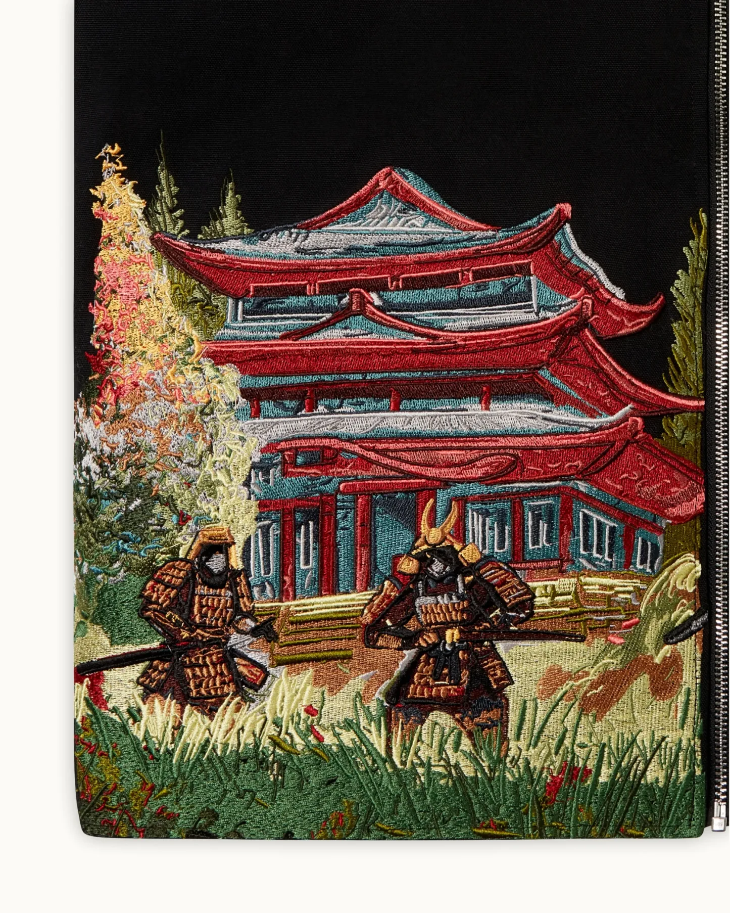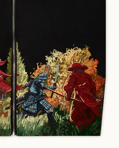 A structured canvas jacket elevated through detailed embroidery rooted in Edo-era storytelling. The front captures two opposing samurai mid-duel, framed by a vivid red pagoda and layered greenery. Executed with precision across a rich palette, the artwork contrasts sharply against the black base.