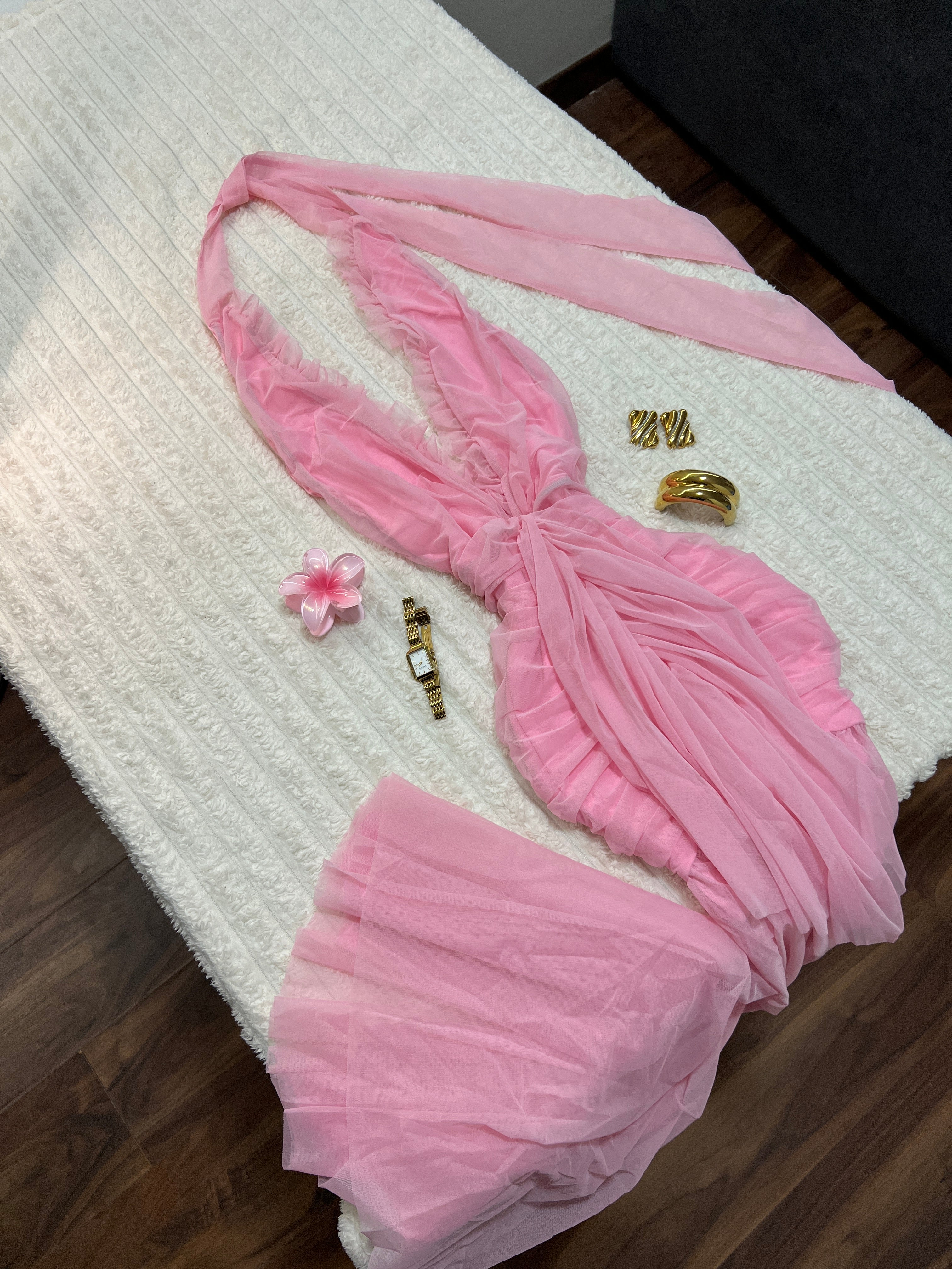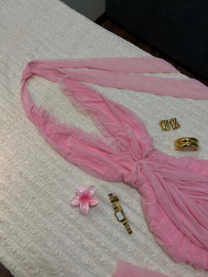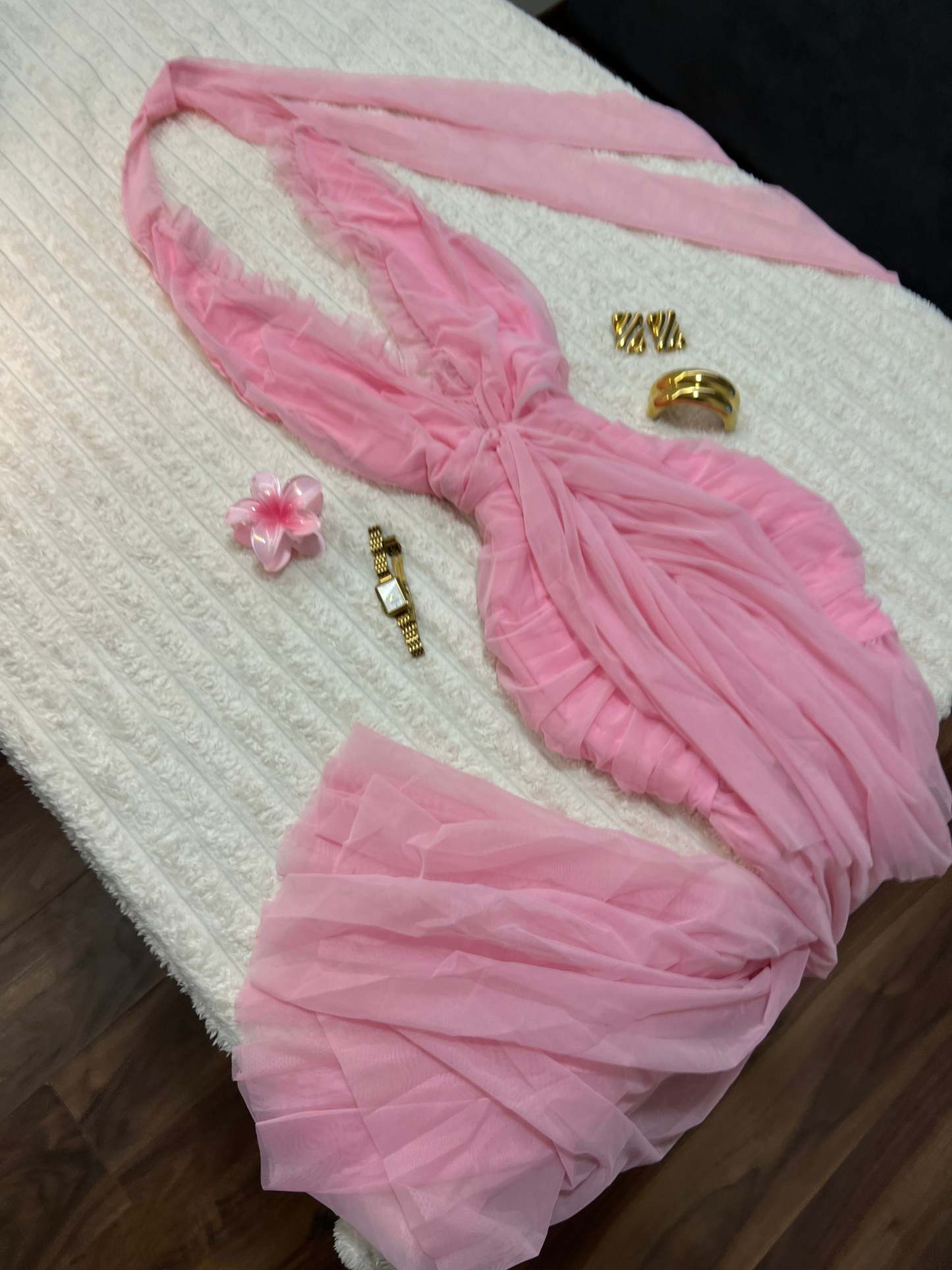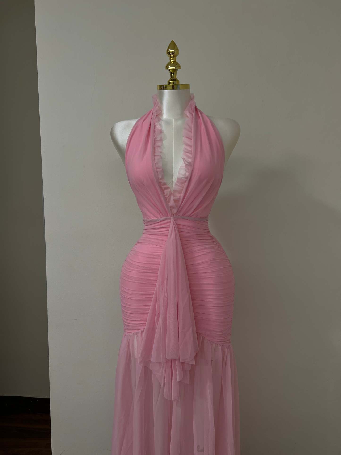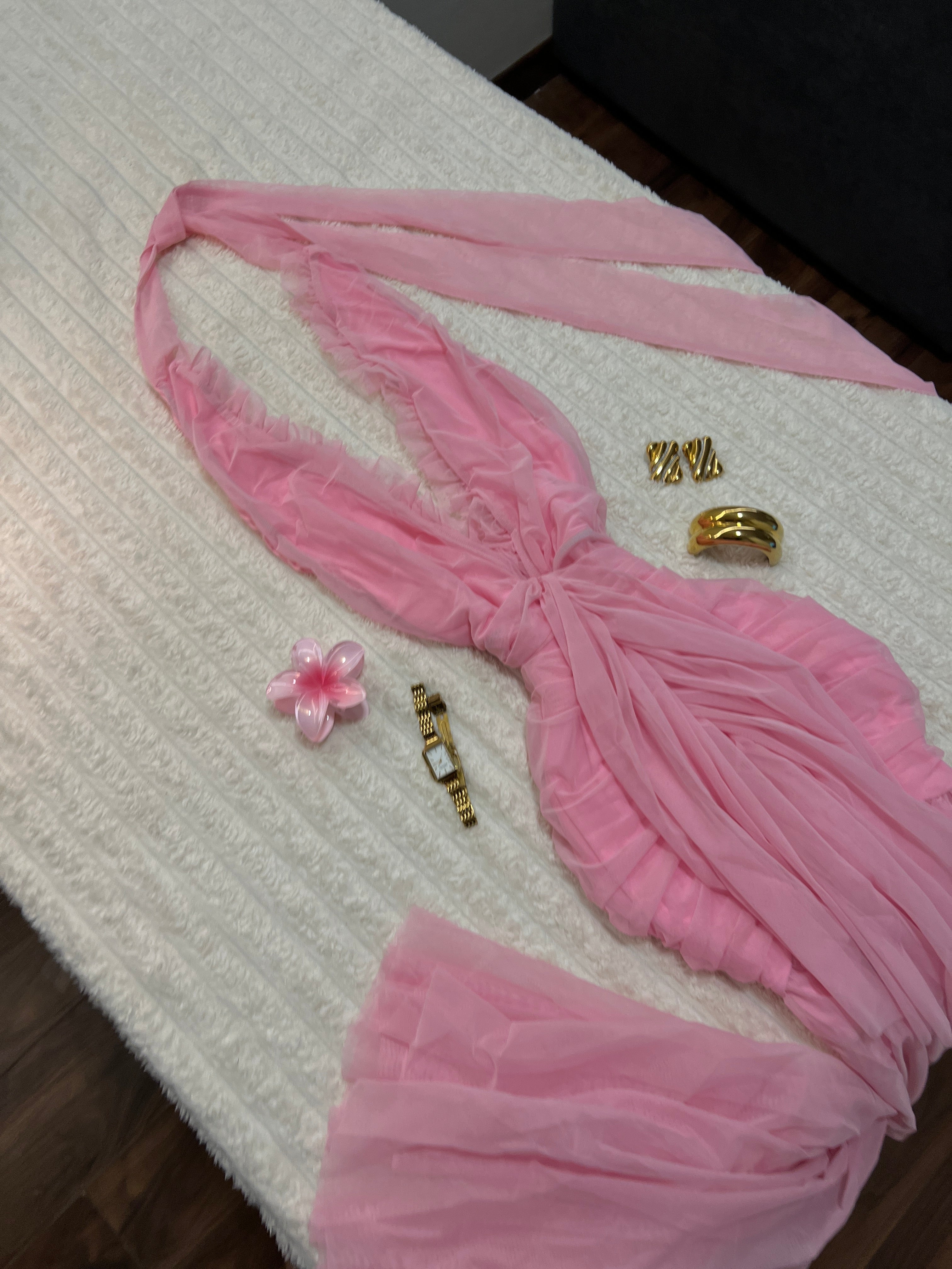 A flirty and feminine pink dress designed to flatter the figure. Featuring delicate details, a body-hugging fit, and a flowing silhouette, this piece is perfect for summer parties, brunches, or special occasions.