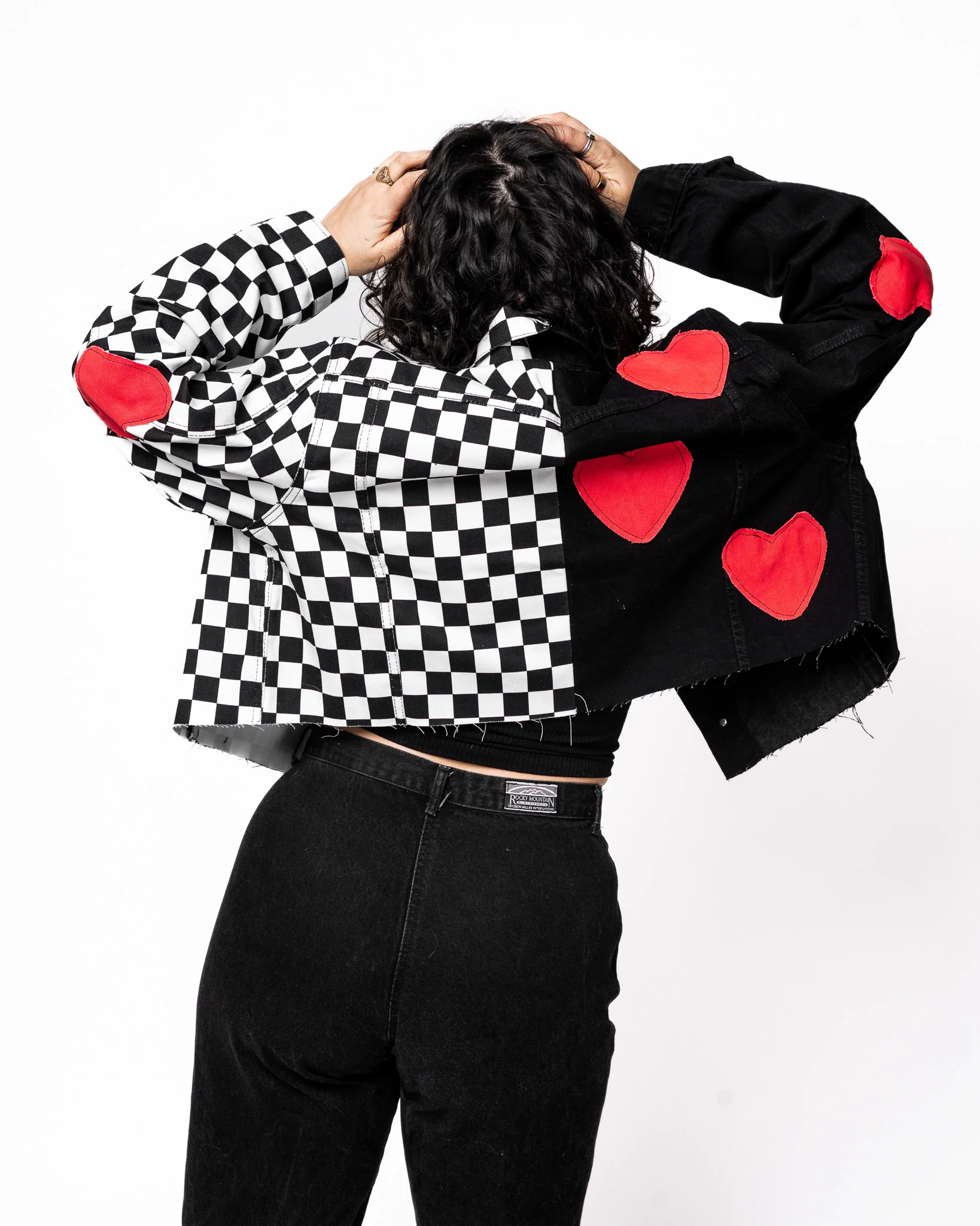 our loudest, most whimsical jacket ever. checkerboard & black split denim jacket. red denim heart patches. want a regular black & checkerboard split jacket? check out our split jacket listing .