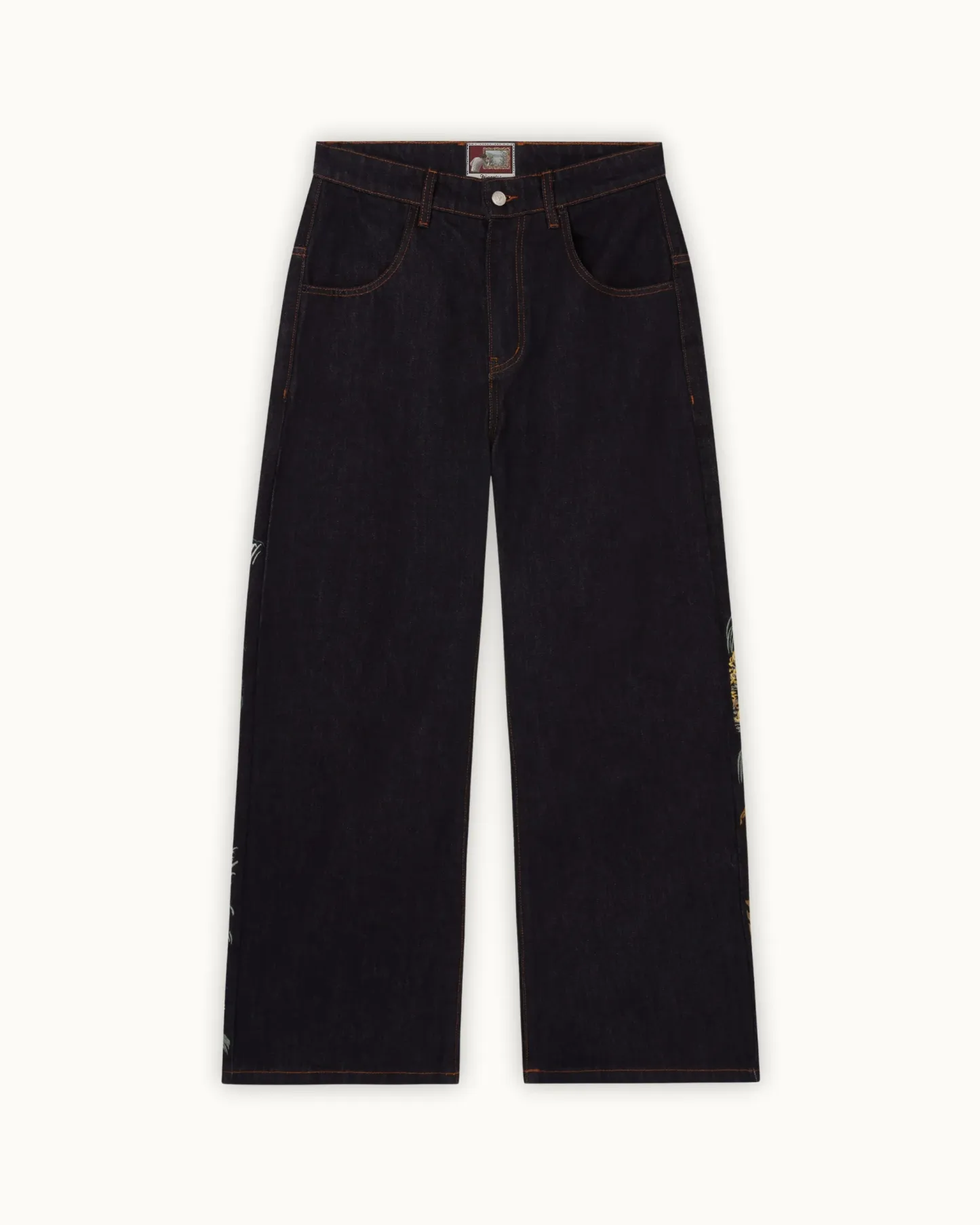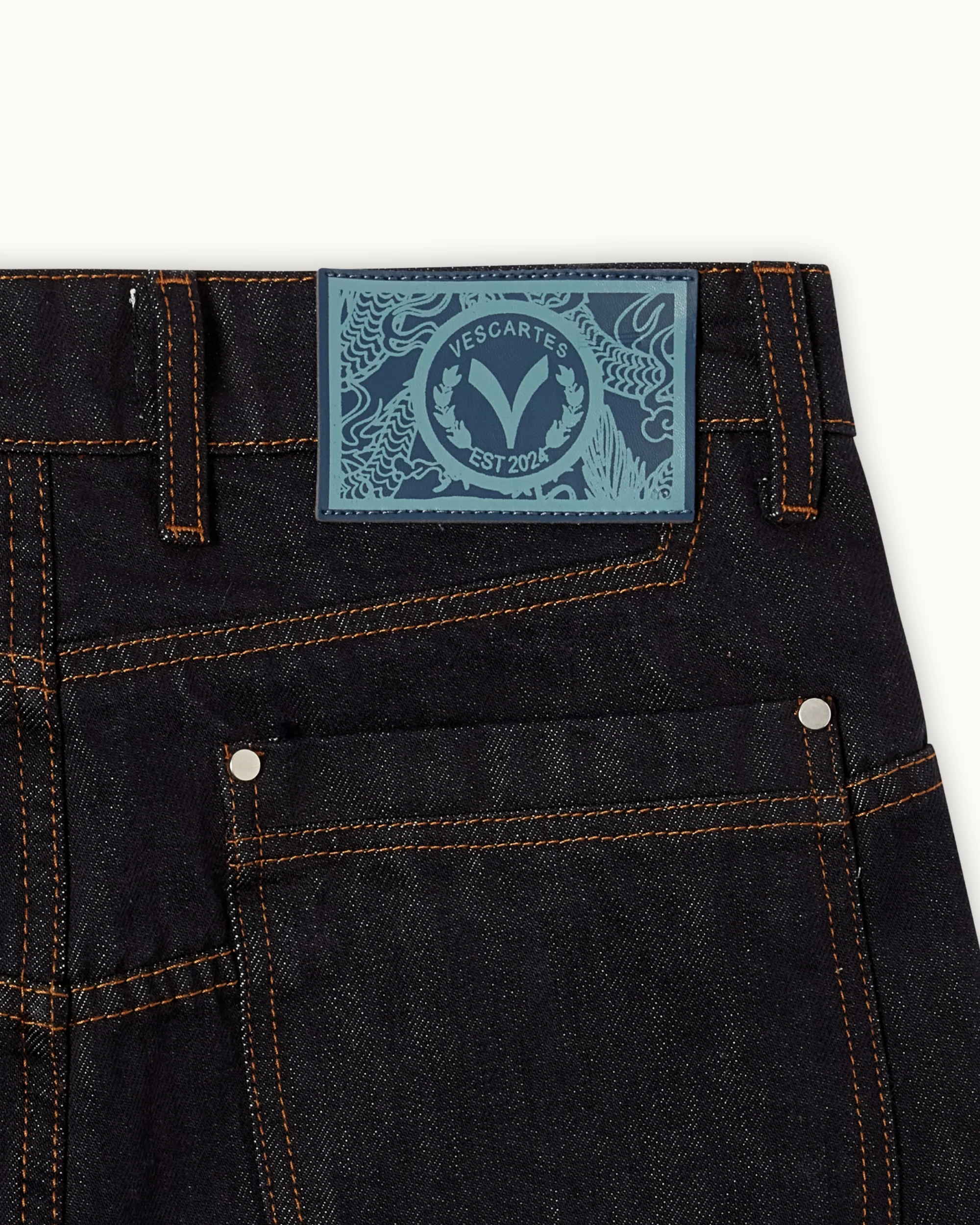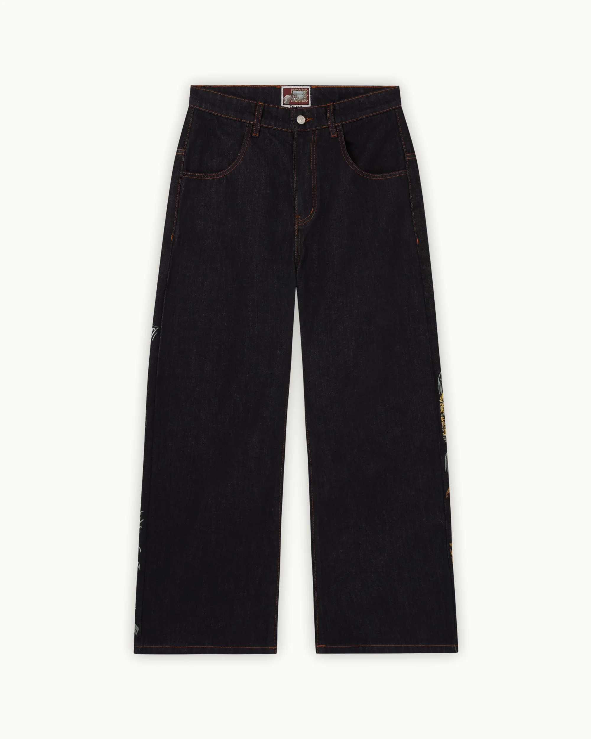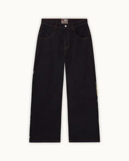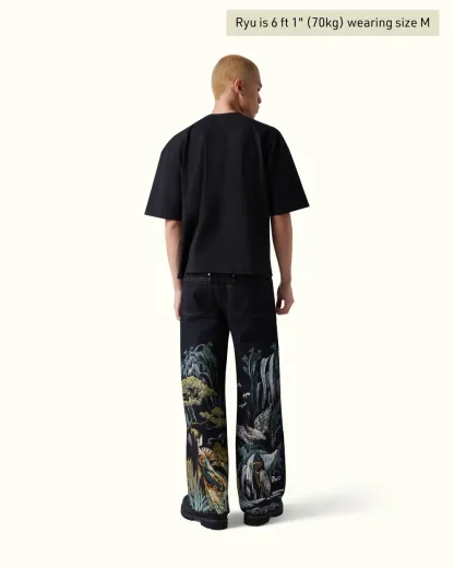 The Tsuru Denim combines a structured silhouette with intricate embroidery across both legs. The artwork unfolds as a continuous landscape, featuring cranes in motion, flowing terrain, and layered natural elements. Built with over 1,000,000 stitches, the composition balances detail with negative space.